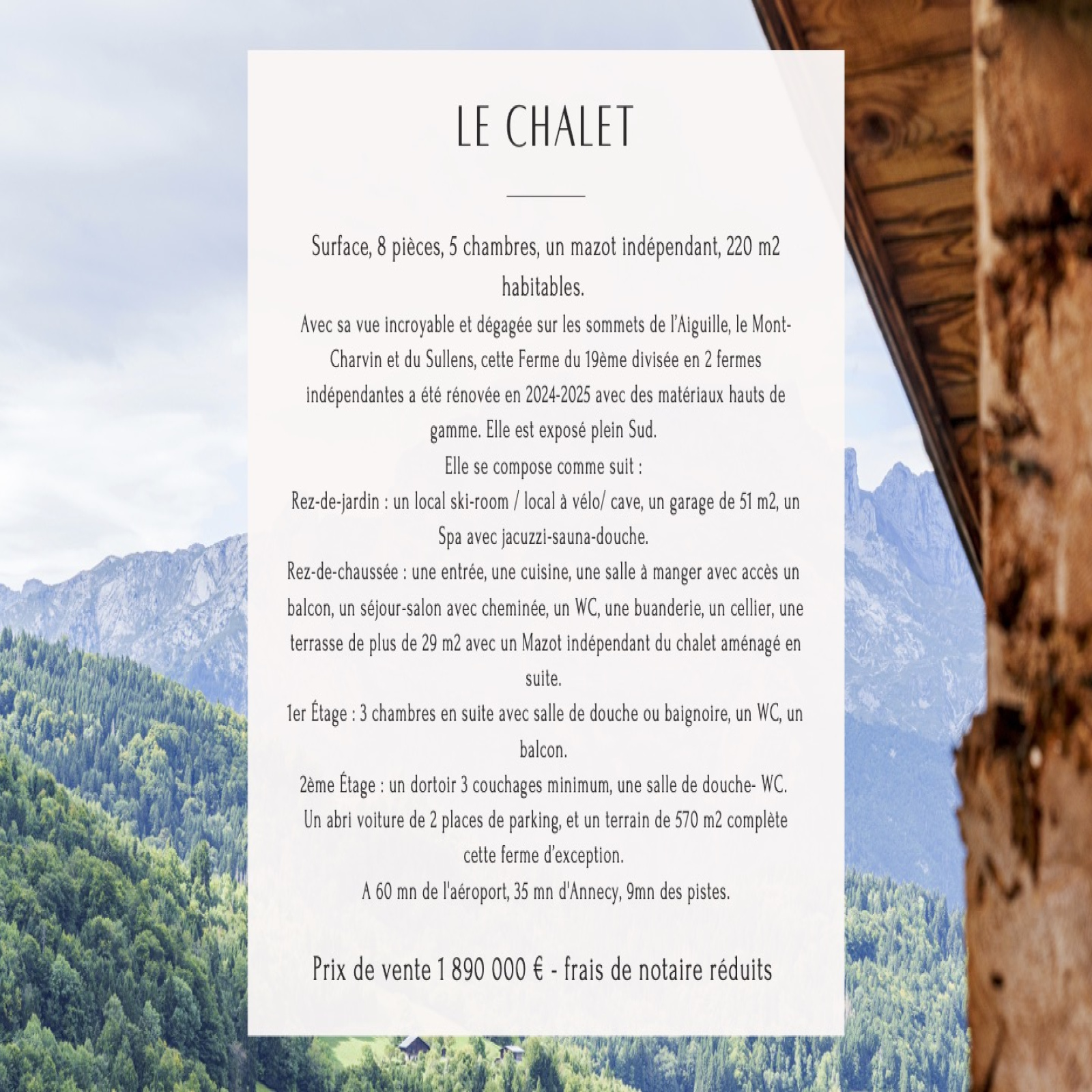 Avec sa vue incroyable et dégagée sur les sommets de l’Aiguille, le Mont-Charvin et du Sullens, cette Ferme du 19ème divisée en 2 fermes indépendantes a été rénovée en 2024-2025 avec des matériaux hauts de gamme.